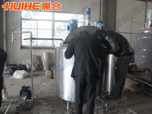 The UK customer wants to buy stainless steel tank to process syrup just like honey. Through many communication and consultation, he ordered 100L and 1000L emulsifying tank each on the end of November in 2014. More than one month, the device is finished successfully. And he came to our factory to inspect the emulsifying tank on January 9th, 2015; and the salesman and the engineer introduced the emulsifying tank patiently and detailed, and he is content with the device very much.